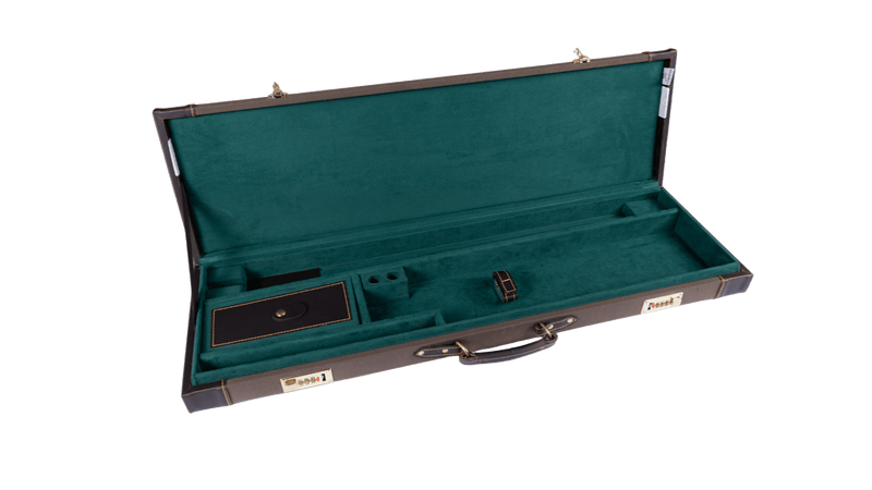 Inside, the case is lined with soft green felt, providing a gentle cushion that protects your firearm’s finish while offering a classic, refined aesthetic that will appeal to enthusiasts of this iconic color. The spacious interior can comfortably accommodate both Side-by-Side (SxS) and Over/Under (O/U) shotguns, thanks to a removable piece in the barrel section of the case that allows easy adjustment to fit either configuration.